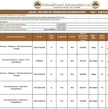 Yes—we provide independent LOLER inspections for arboricultural gear including ropes, karabiners, harnesses, and rigging systems. Each inspection includes a detailed report and certification for compliance